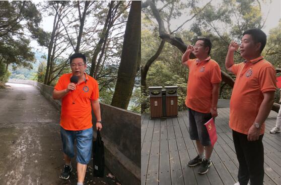 福州联合调研中心党支部书记刘继明同志和刘冰同志,在古道风景亭上,面向鲜红的党旗,组织全体党员重温入党誓词。